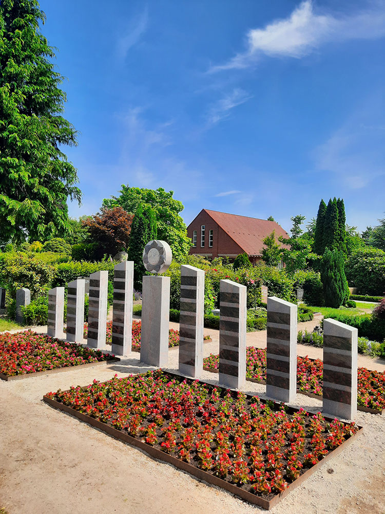 Auswahl aus verschieden angelegten Blumenbeeten mit unterschiedlichen Denkmälern möglich. Die Beete variieren durch die Variationen der Staudenbepflanzungen. Belegung mit bis zu zwei Urnen, ein individueller liegender oder stehender Grabstein ist möglich. Eine kleine Fläche vor dem Grabmal dient der Blumen- und Gesteckablage. Pflege und Bepflanzung der Anlage erfolgt nur durch den Friedhof, eigene Bepflanzung ist nicht gestattet.